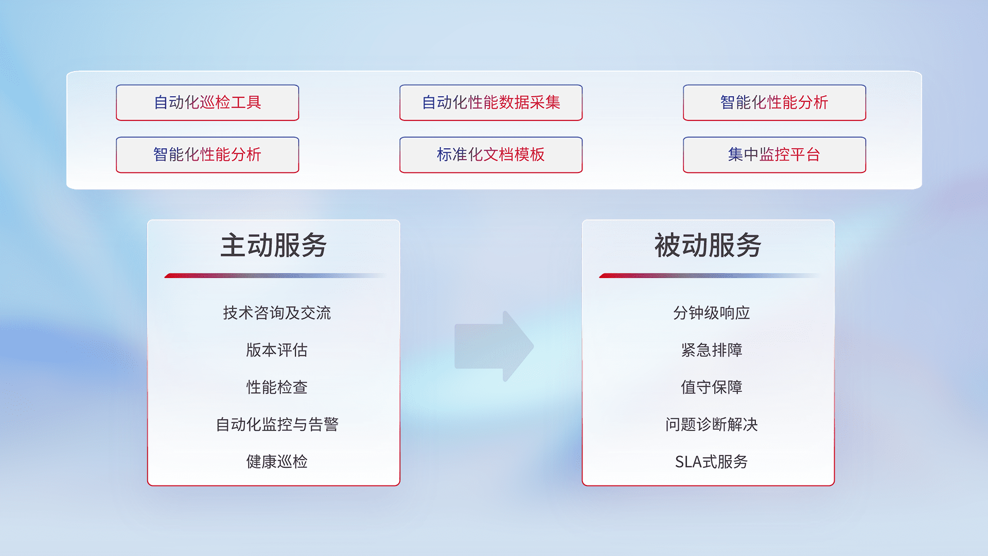 智能化工具和标准化文档,,,保障服务质量,,,,提供主动服务(包含技术咨询、、版本评估、、、、性能检查、、、、自动化监控与告警、、、健康巡检)和被动服务包含(分钟级响应、、、、紧急排障、、、值守保障、、问题诊断解决、、、SLA服务)。。。